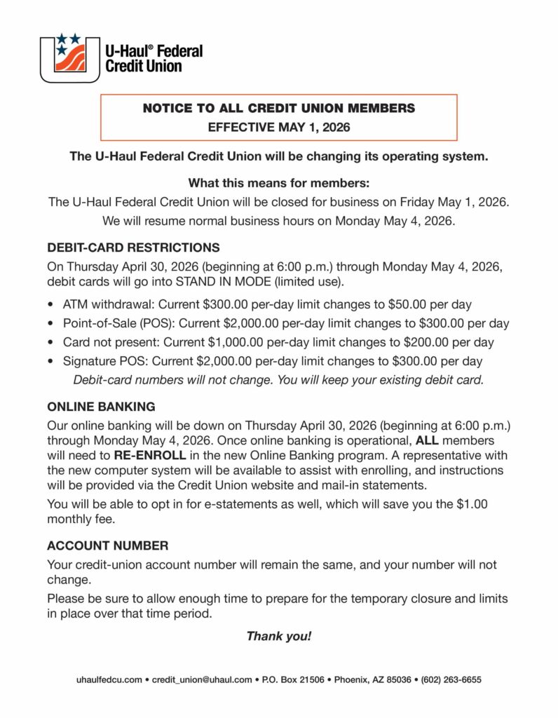 CURRENTLY THE CREDIT UNION ONLINE BANKING AND LOAN PROGRAMS ARE EXPERIENCING COMMUNICATION ISSUES. WE ARE WORKING QUICKLY TO GET THIS RESOLVED. THANK YOU FOR YOUR PATIENCE. YOU CAN ALWAYS CALL THE CREDIT UNION FOR BALANCES ANYTIME 602-263-6655 CINDI HERMAN, MANAGER